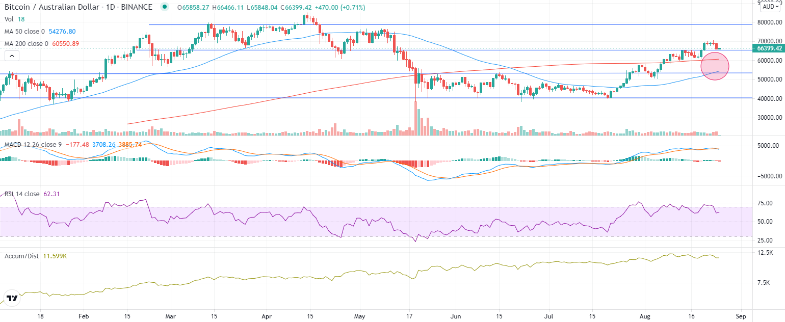Bitcoin has broken AU$65k resistance and testing AU$70k