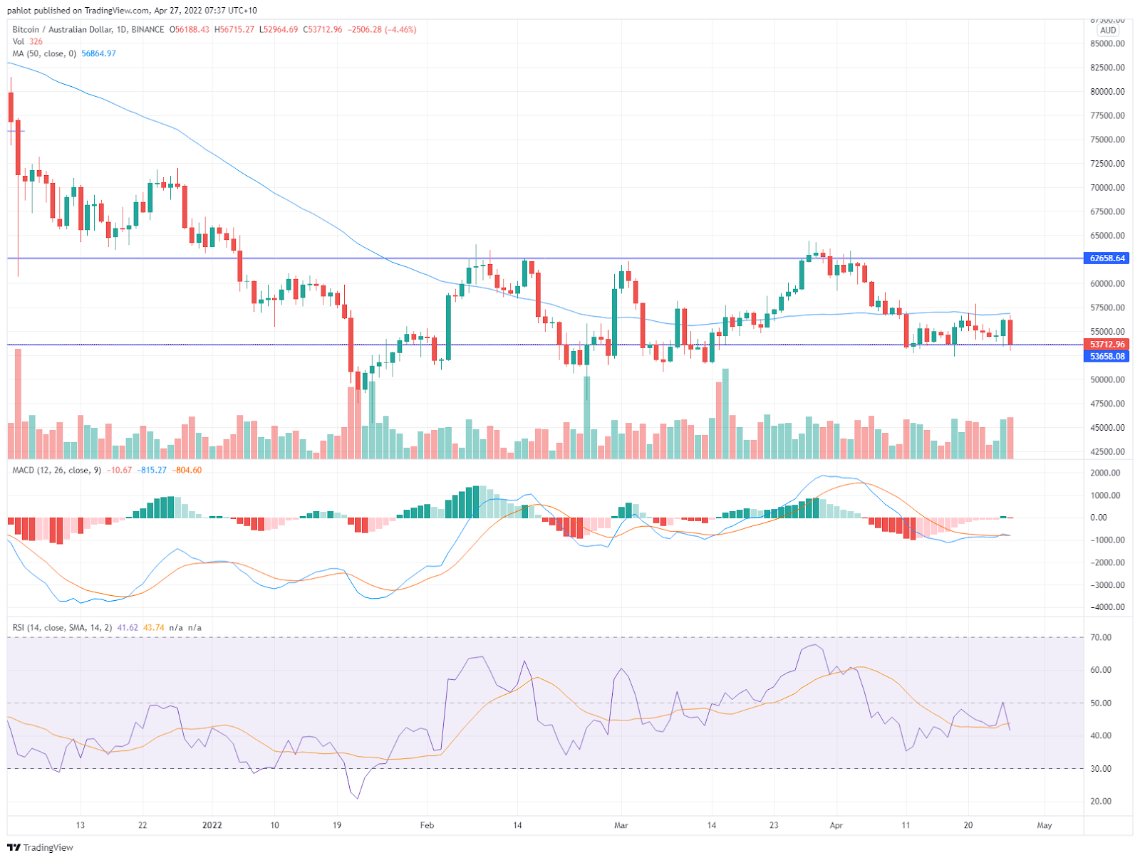 - Bitcoin (BTC) down 4.5% for the day, finding support at the previous support level of AUD $53,700.
