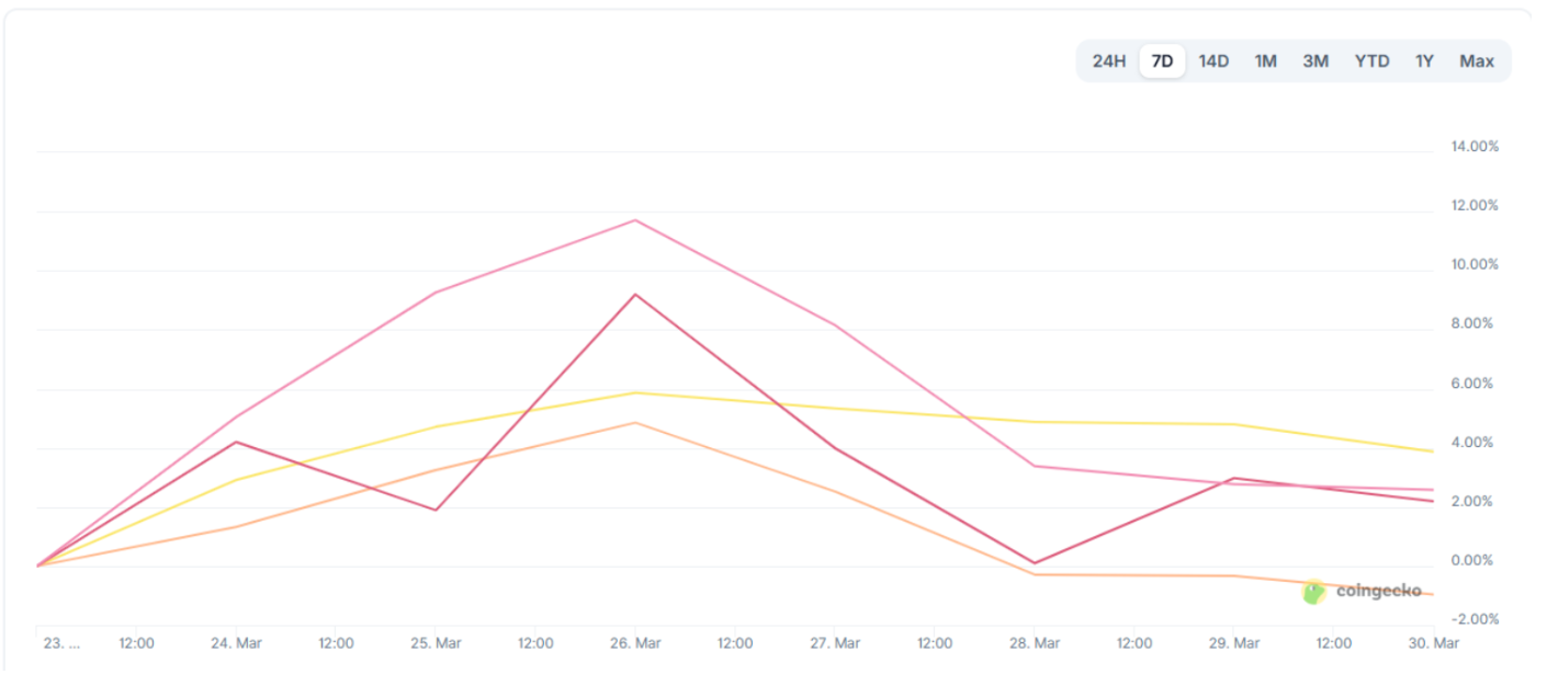Altcoins stayed steady over the past 7 days. Earlier in the week, momentum picked up across most sectors before fading into the weekend, with gains cooling off across the board.