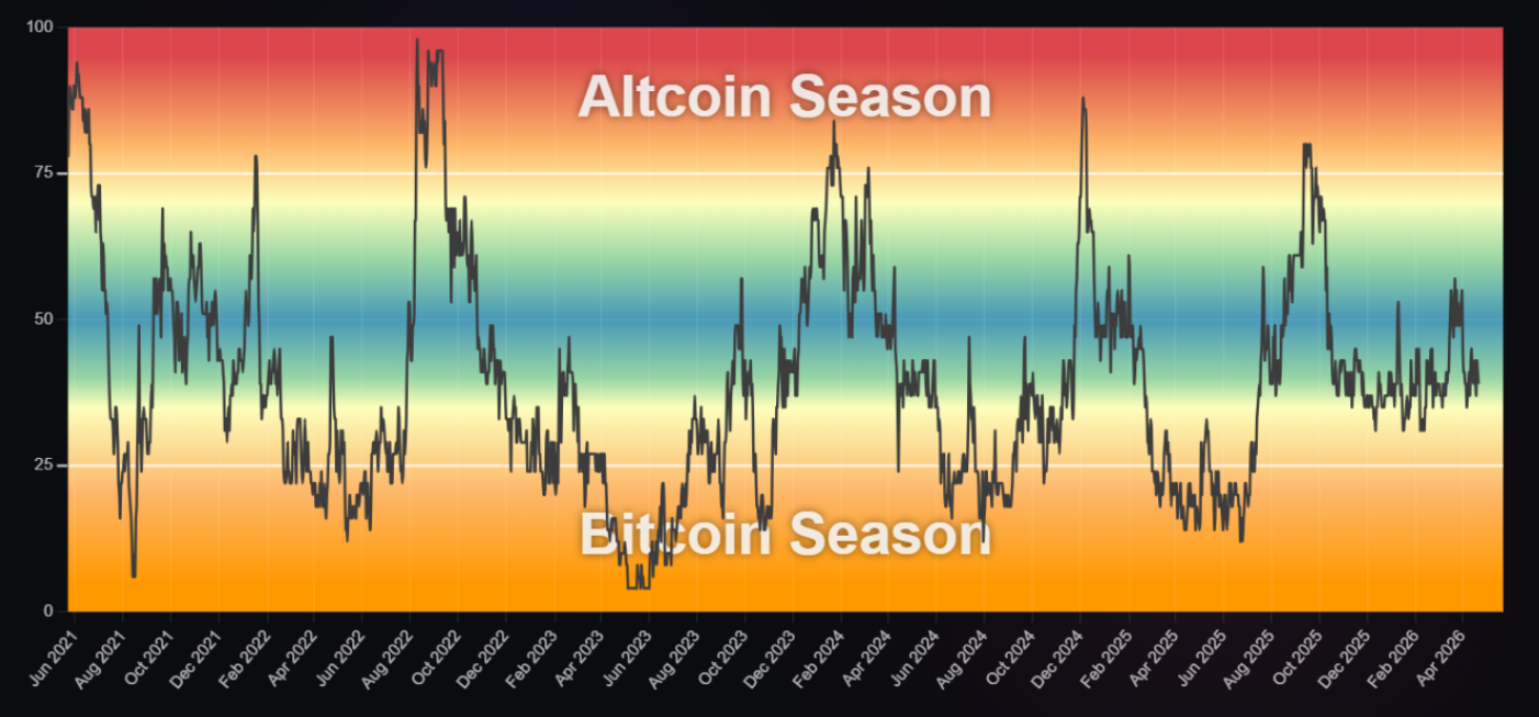 The Altcoin Season Index sits at 39, sitting closer to BTC territory.