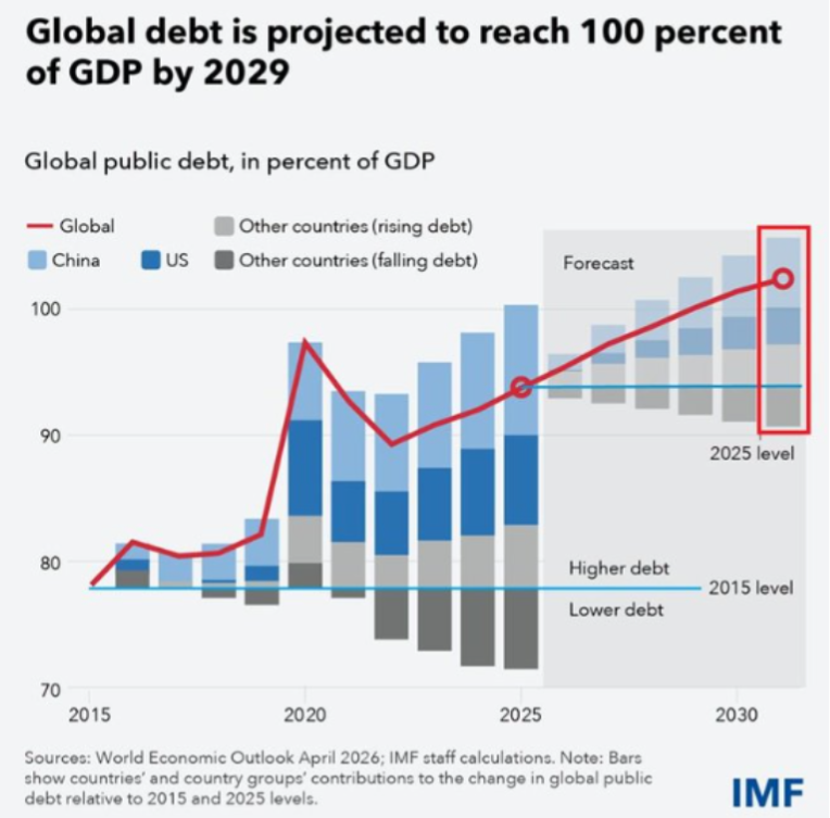 Then there’s the bigger backdrop: debt. The IMF now expects global government debt to reach 102% of GDP by 2030, a level not seen since World War II, with the US and China driving much of the increase. The chart shows the direction clearly: public debt is still rising, and structurally higher debt levels are becoming part of the macro landscape rather than a temporary issue.