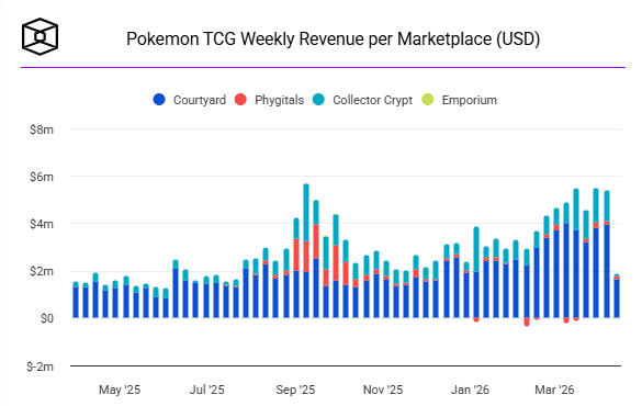 Weekly revenue across Pokémon TCG marketplaces just hit $5.38M, sitting just below all-time highs. But the important part isn’t the number, it’s the structure.