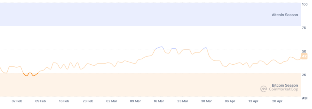 The Altseason Index is currently sitting around 42, keeping the market firmly in the middle ground between Bitcoin Season and Altcoin Season