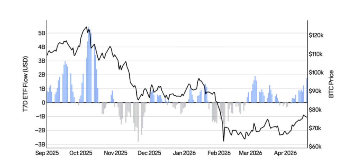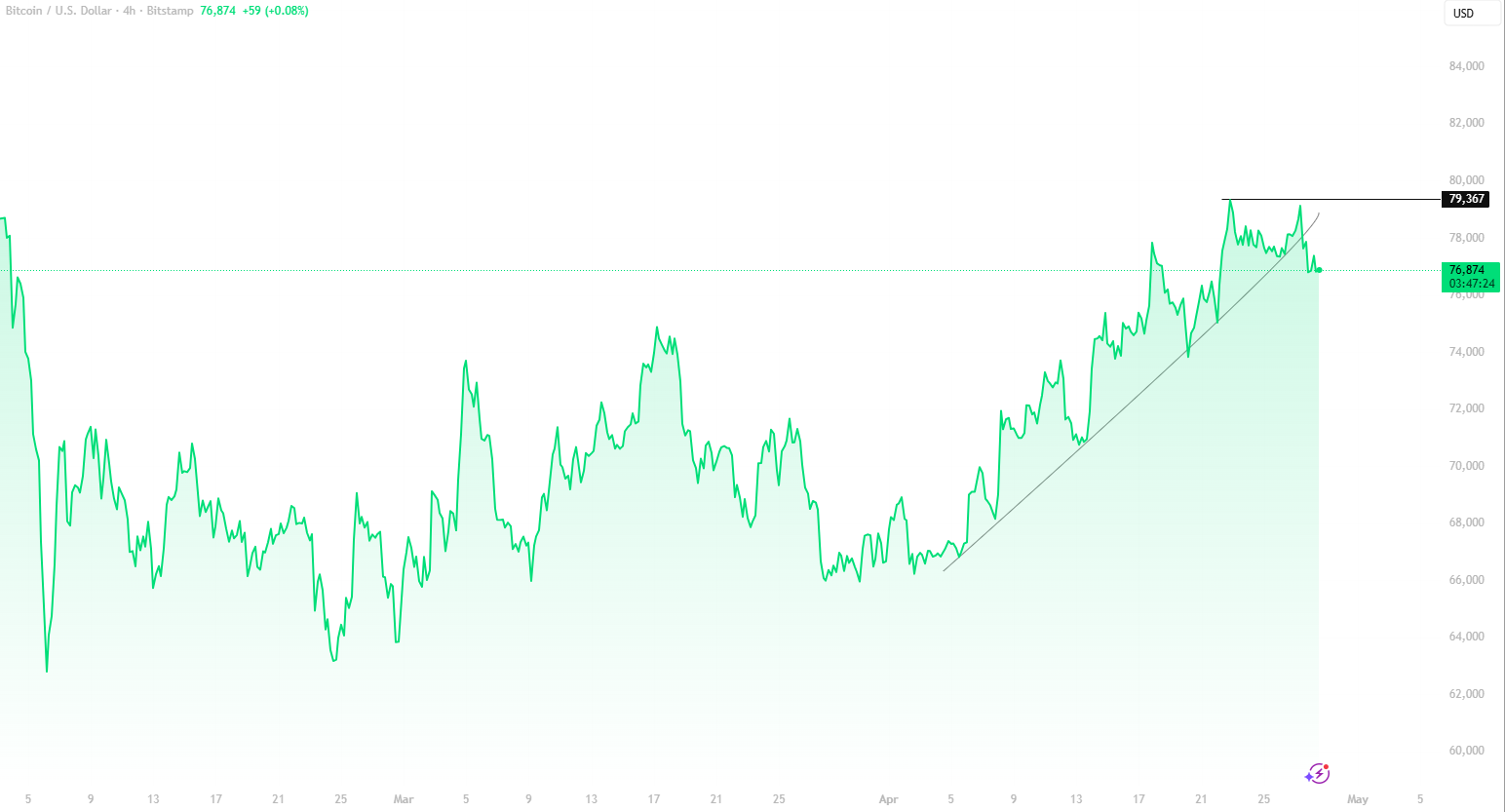 Bitcoin has rallied strongly since the beginning of April, climbing back toward the upper end of the current range near $79K.