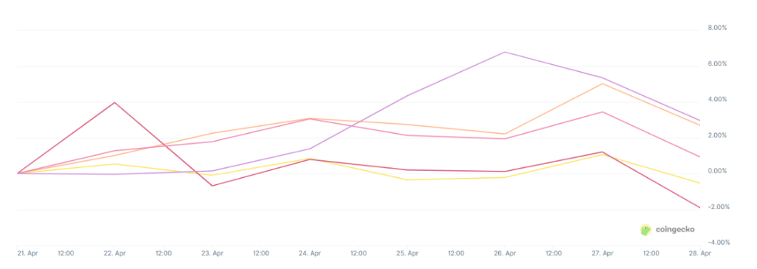 This week’s strongest sector was Gaming, up 2.97% over the past 7 days, followed closely by DeFi at +2.70%. AI tokens also stayed positive at +0.93%, while RWA projects cooled slightly, falling 0.53% after several strong weeks of outperformance.