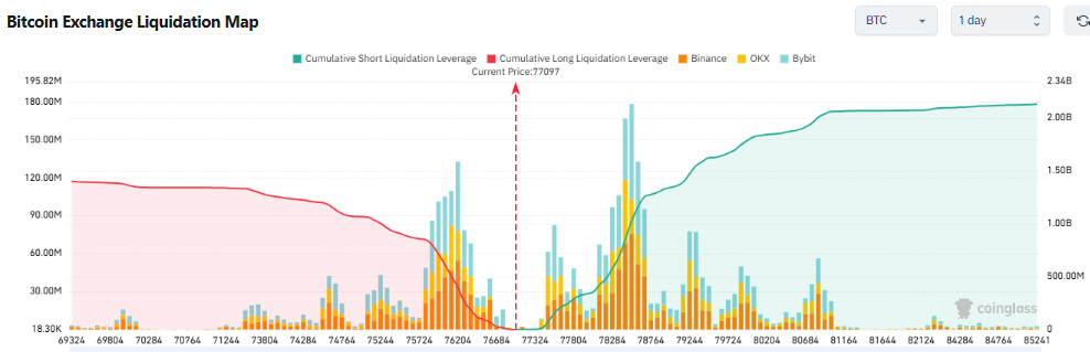 Bitcoin liquidation maps continue to show a larger concentration of liquidity sitting above current price, particularly around the $78K–$80K region.