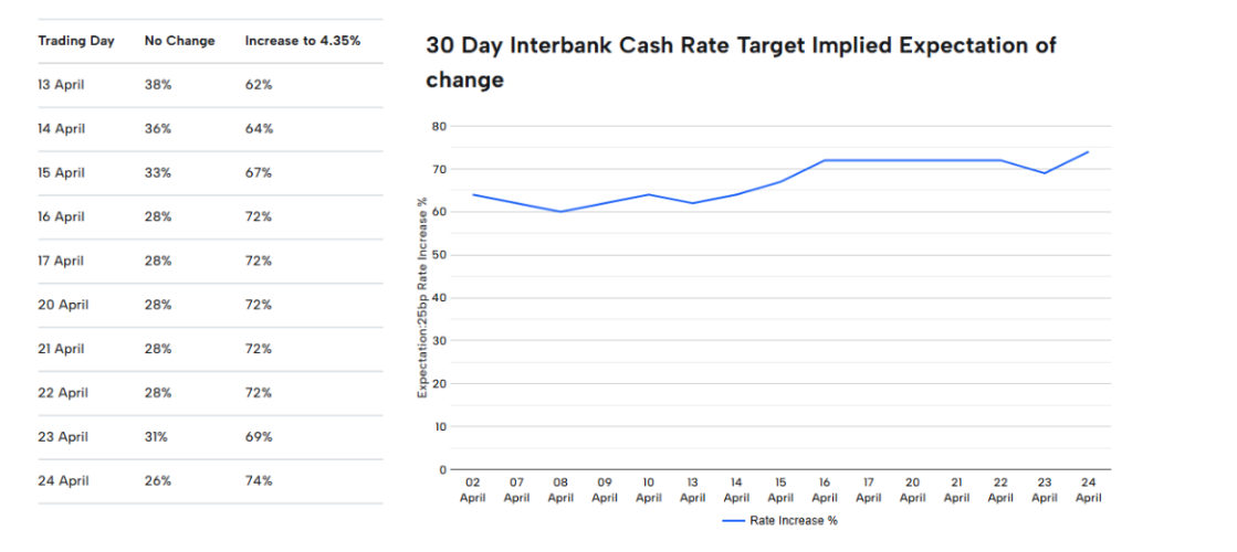 The market is increasingly pricing in another RBA rate hike at the upcoming May 5 meeting.