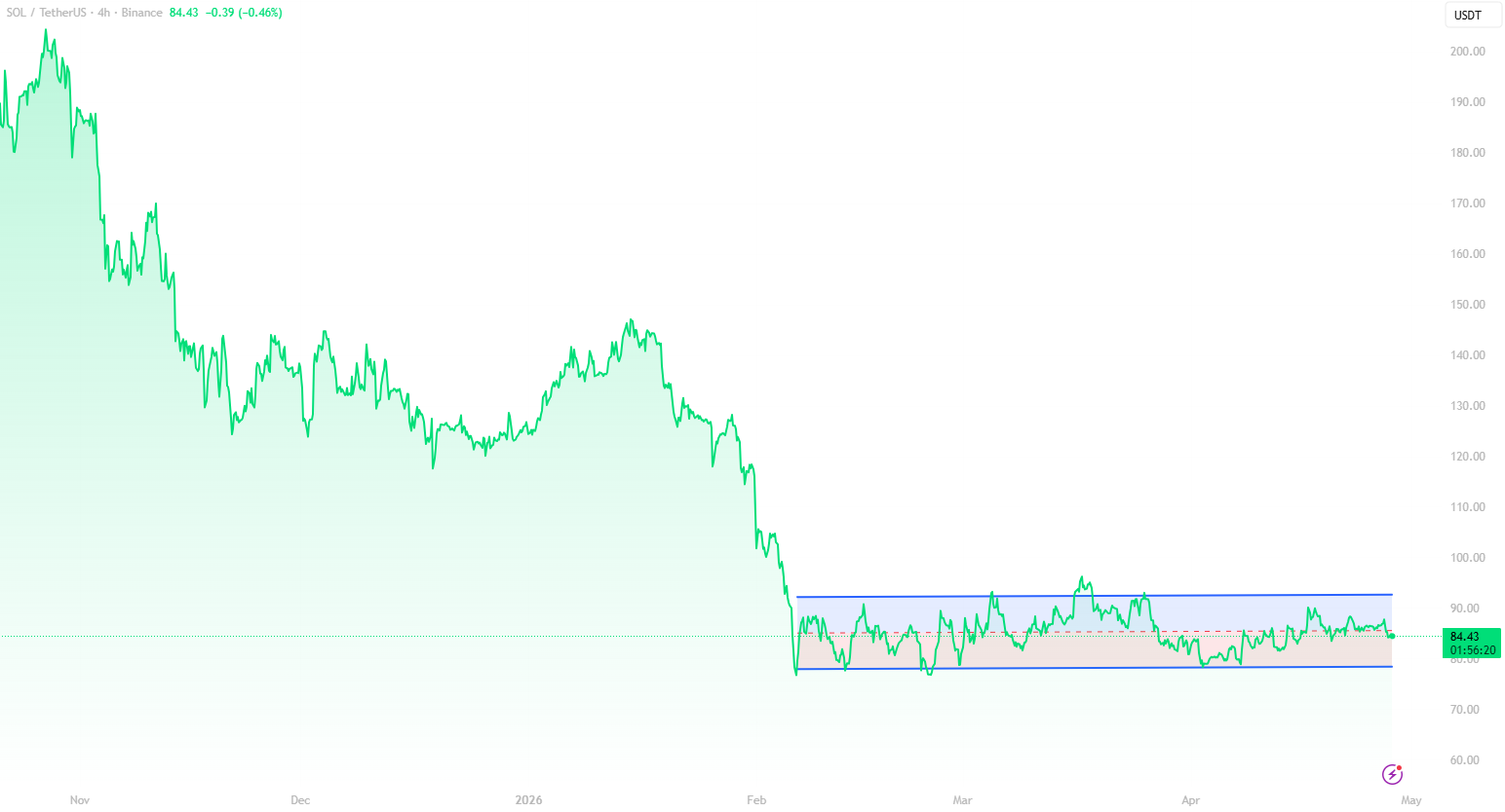 On the chart SOL has been grinding sideways in a tight range since early February, with price continuing to consolidate after the sharp sell-off earlier in the year.