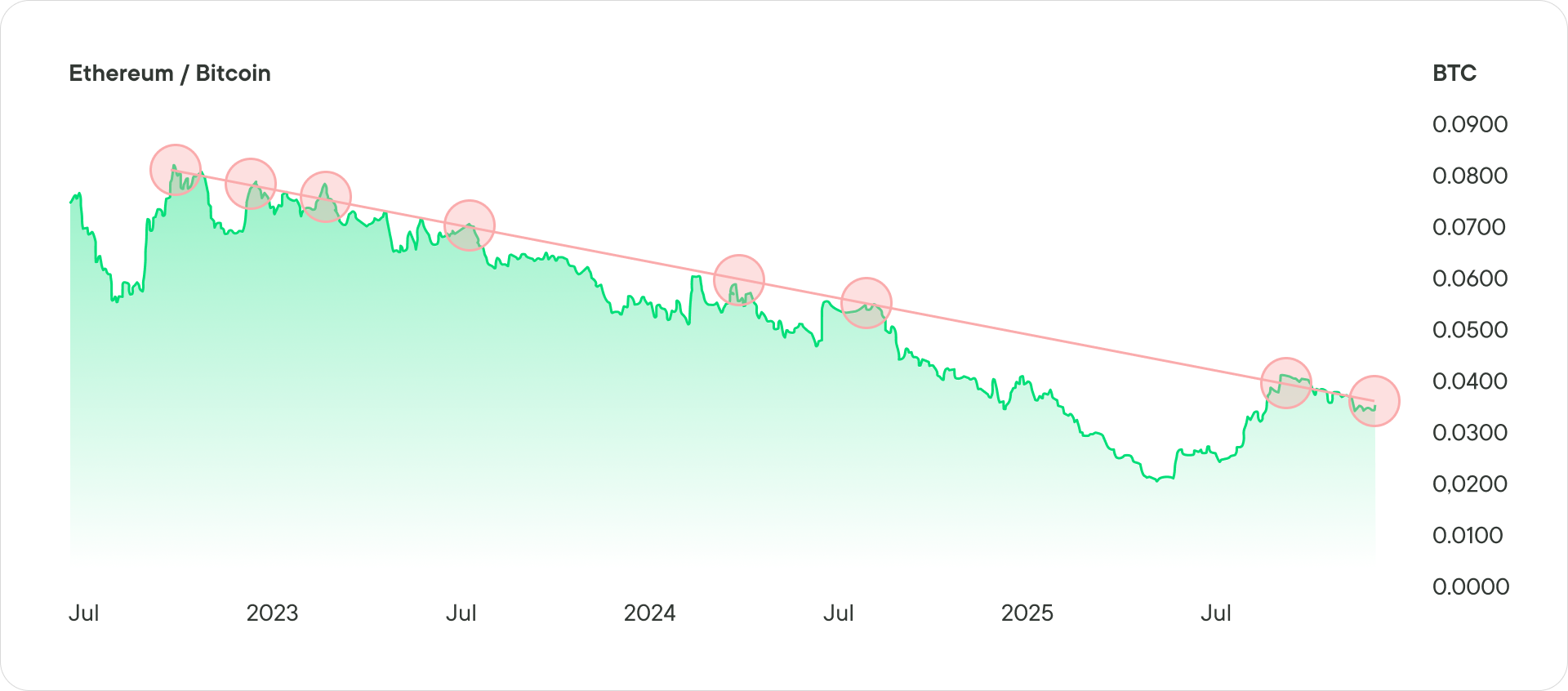 ETH strengthened across the year as on-chain activity surged. Lower fees, faster settlement, and consistent upgrades pushed more developers and more users onto the network. DeFi, NFTs, and tokenised assets still run on Ethereum first.ETH has underperformed BTC through 2025, keeping the ETH/BTC pair in a long-term downtrend that reflects Bitcoin’s relative strength this cycle. If ETH decisively breaks above this trend line, it could signal capital rotation into Ethereum and broader altcoins, potentially marking the start of an alt season. 2026 is going to be a fun watch.