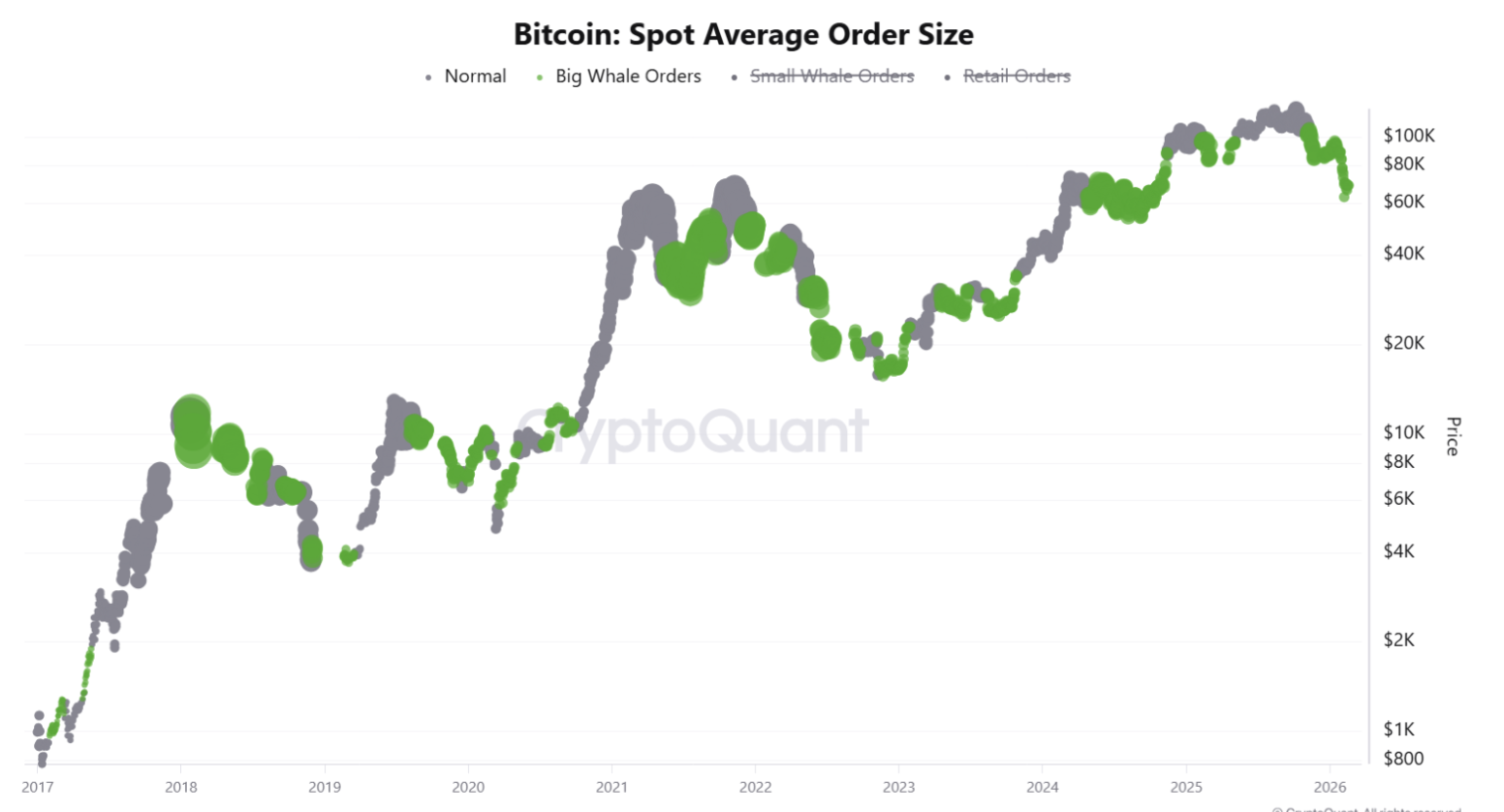 Zooming out to whale activity, the chart shows large order clusters appearing again near current levels. Historically, elevated whale participation tends to show up around major inflection points, not quiet trends.