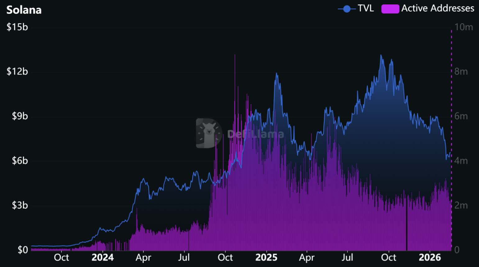 Onchain, TVL has cooled from roughly US$13B to around US$6B.