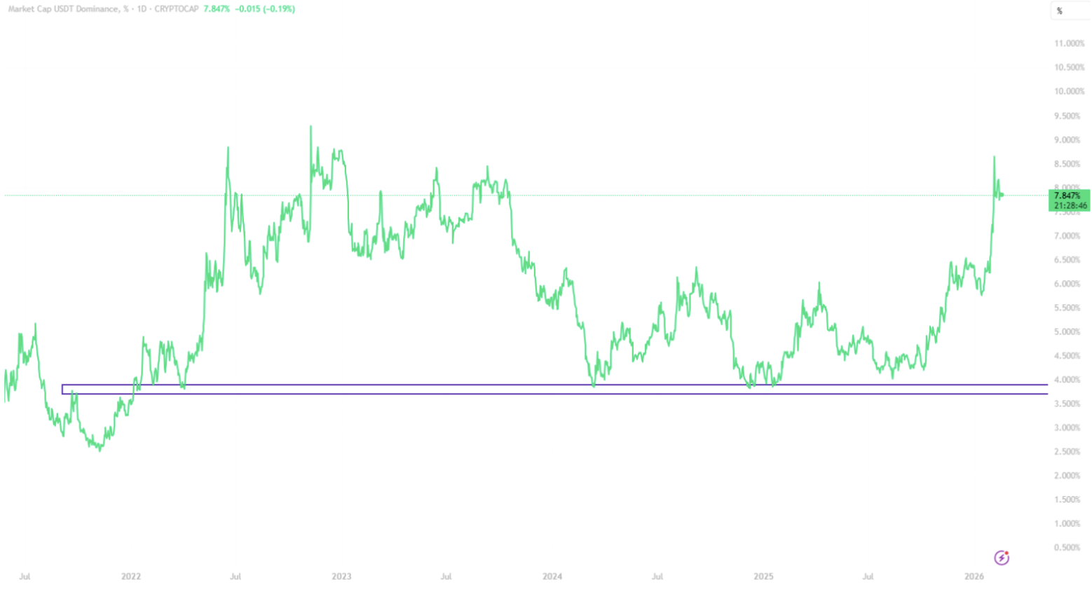 USDT dominance has pushed higher recently, meaning a larger share of total crypto market cap is sitting in Tether. When dominance rises, it usually signals capital rotating out of risk and into sidelines.