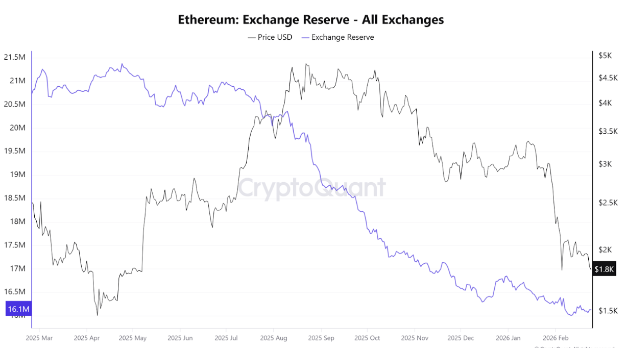 Ethereum exchange reserves continue to trend lower, meaning fewer ETH are sitting on centralised exchanges and available for immediate sale. Unlike previous capitulation phases, there has not been a sharp spike in exchange inflows. This suggests recent price weakness has not yet translated into broad panic distribution, with much of the supply remaining staked or held off-exchange.