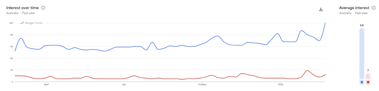 Over the past few months, searches for “Gold” have picked up noticeably, while “Bitcoin” has stayed relatively flat.