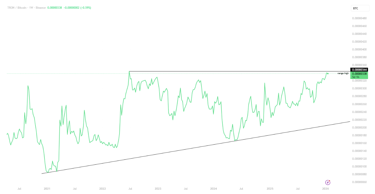 Tron has traded in a broad consolidation range against BTC since 2019, cycling through periods of relative strength and weakness. Price is now sitting near the top of that long-term range, with TRX pressing against resistance and positioning for a potential breakout versus Bitcoin after nearly six years of consolidation.\ \ Keep your eyes on this chart!
