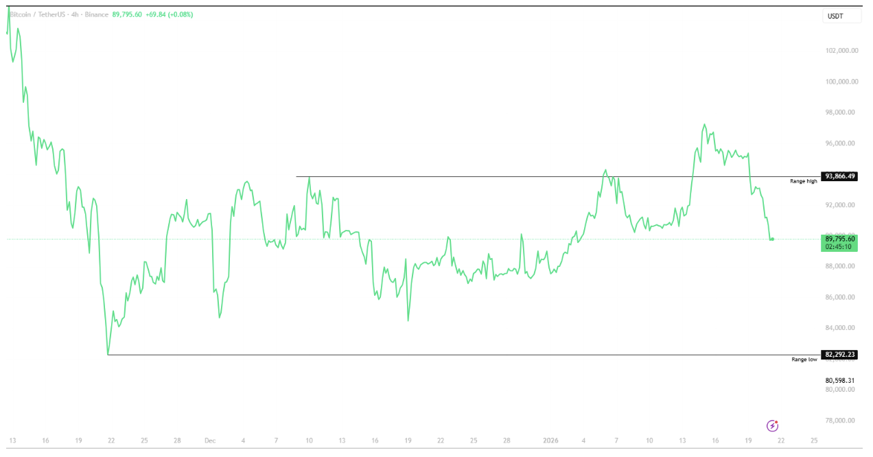 Donald Trump’s comments around “tariffs” rattled risk markets, triggering a broad sell-off that dragged BTC straight back into its prior range around $89.8k USD. Adding fuel to the move, tensions between the US and Europe escalated after Greenland became part of the conversation, with the EU floating a potential “trade bazooka.” That could mean restricted access to EU markets or export controls, lifting global uncertainty.