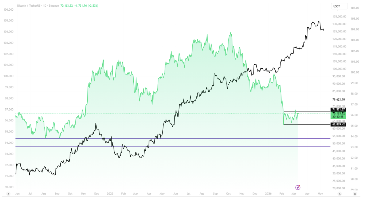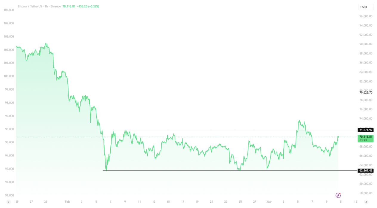 Price briefly pushed above $71,571, but momentum faded quickly and BTC slipped back into the range. If bulls cannot reclaim and hold above the $71.5K level, the next area to watch sits closer to $62K.