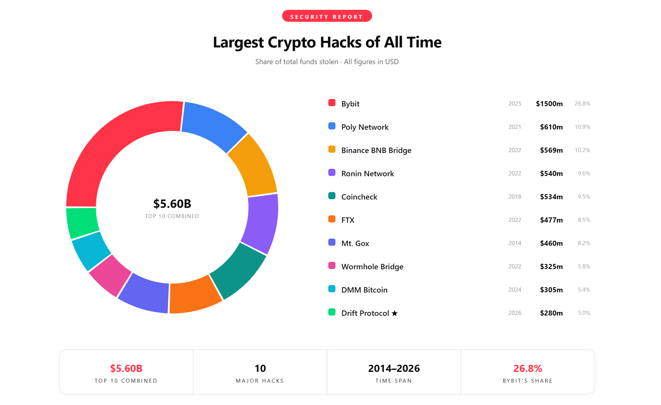 The Drift Exploit is now one of the largest hacks in crypto history. Between 2014 to 2026, there have been 10 major hacks with a combined $5.60 Billion (USD) funds affected.